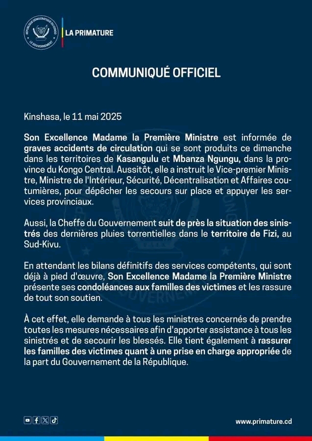 Kasangulu, Mbanza Ngungu et Fizi endeuillés : la Première Ministre ordonne une riposte urgente