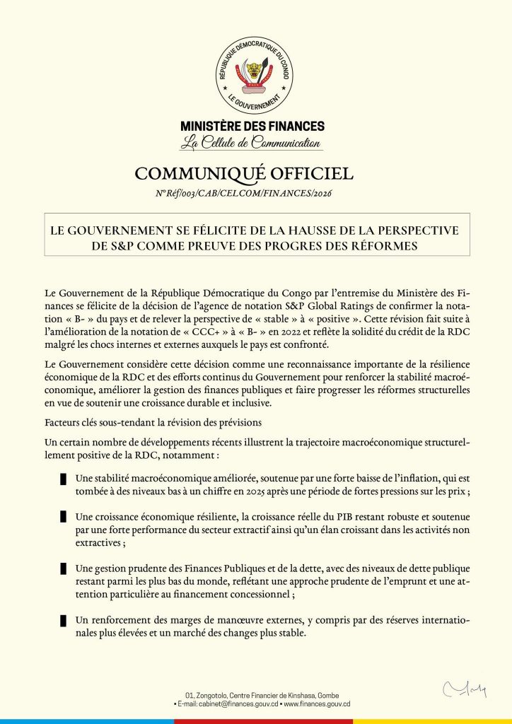Le Gouvernement de la RDC, par l’entremise du ministère des Finances, s’est félicité de la décision de S&P Global Ratings de maintenir la note souveraine du pays à « B- » tout en relevant la perspective de « stable » à « positive ». Cette évolution traduit une amélioration progressive de la situation économique nationale.