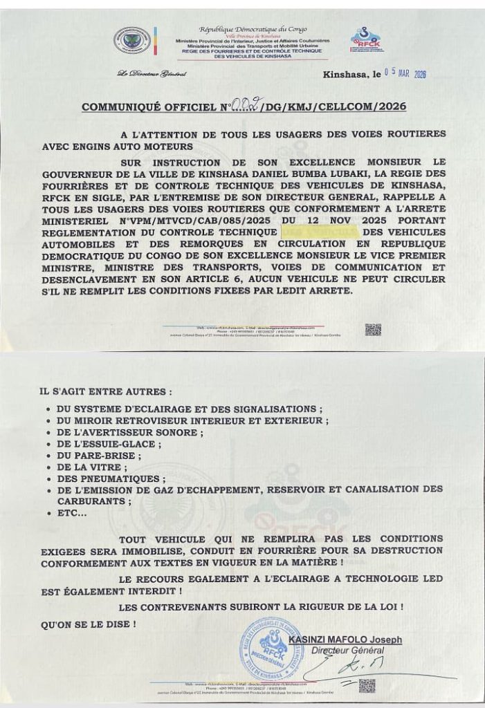 Cette décision s’appuie sur l’arrêté du 12 novembre 2025 signé par le Vice-Premier ministre en charge des Transports et Voies de communication. Les services compétents sont appelés à veiller strictement au respect des normes techniques exigées pour tous les véhicules circulant à Kinshasa.